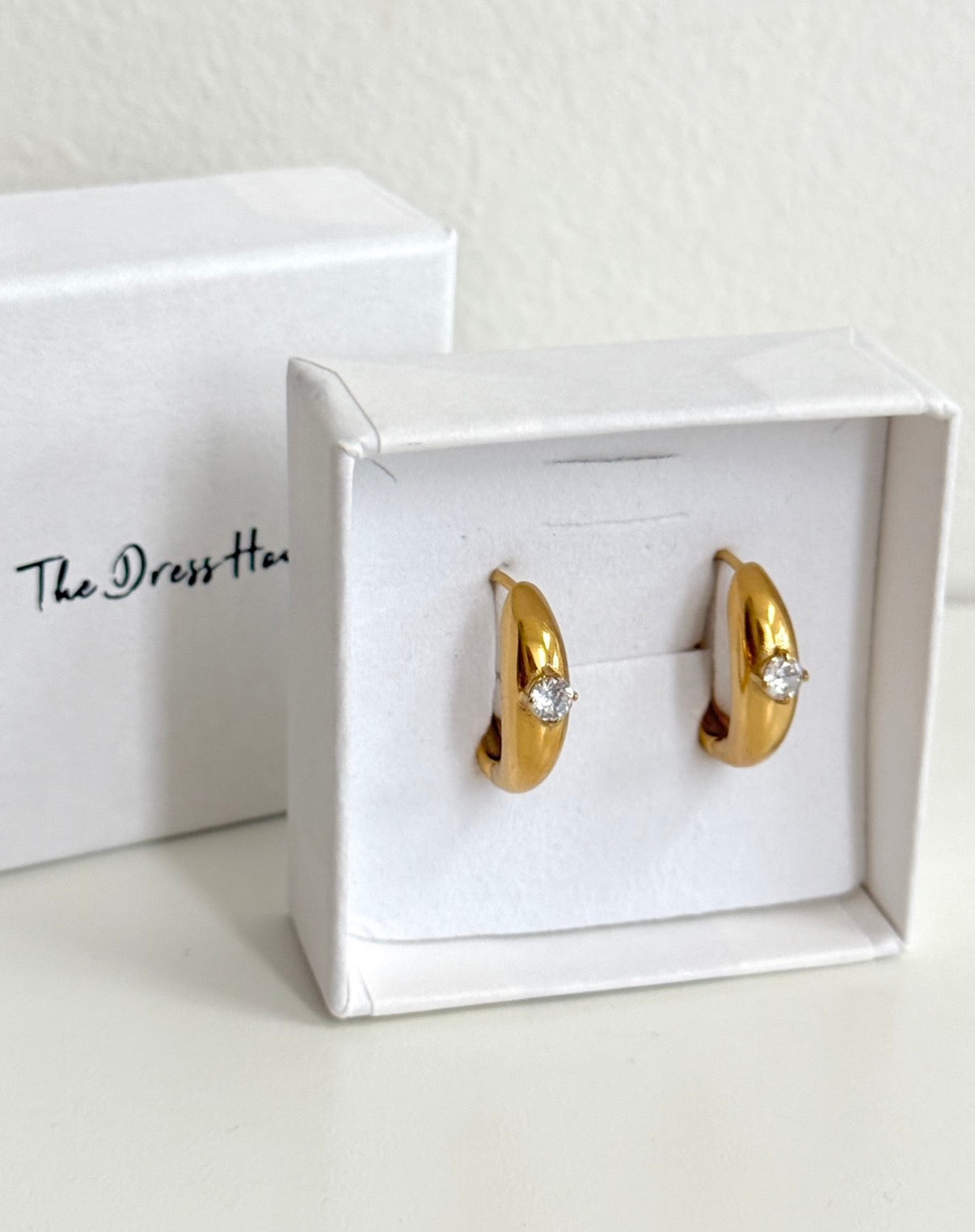 Designed for everyday wear and active lifestyles, this gold hoop earring features a single diamanté set neatly in the very centre for a clean, modern finish. Simple yet polished, it adds a subtle touch of sparkle while remaining practical enough to wear all day.