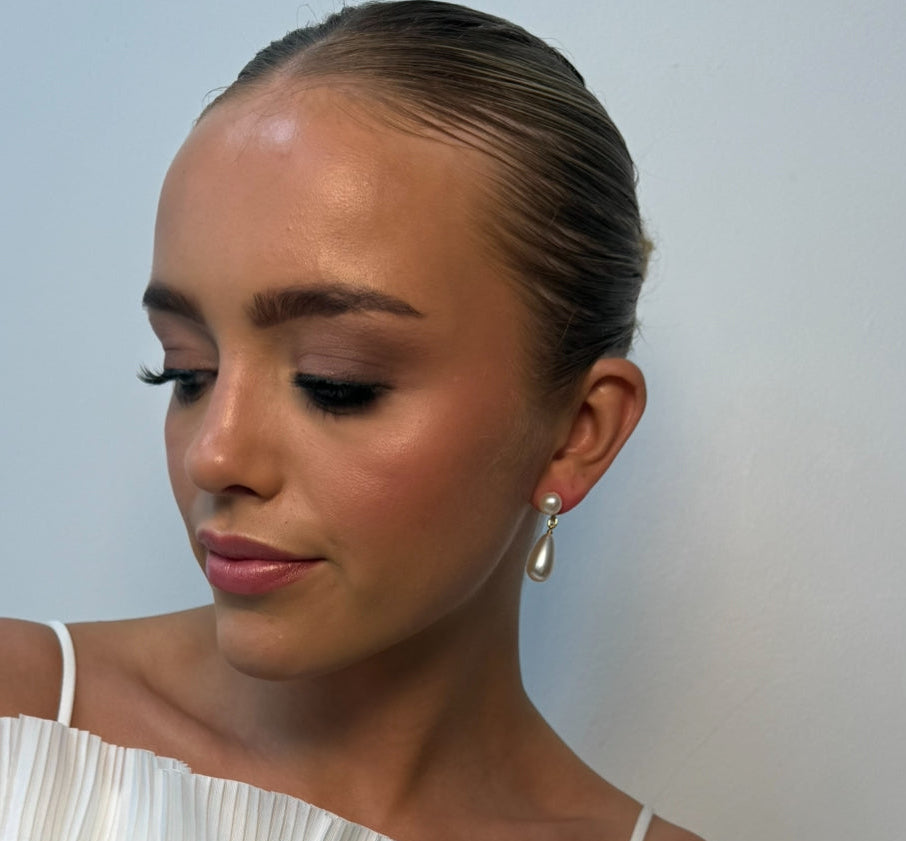 Elevate your bridal look with these timeless gold pearl teardrop earrings. Designed with a luminous pearl drop in a delicate teardrop shape, they hang gracefully at 3cm length, creating the perfect balance of elegance and sophistication.