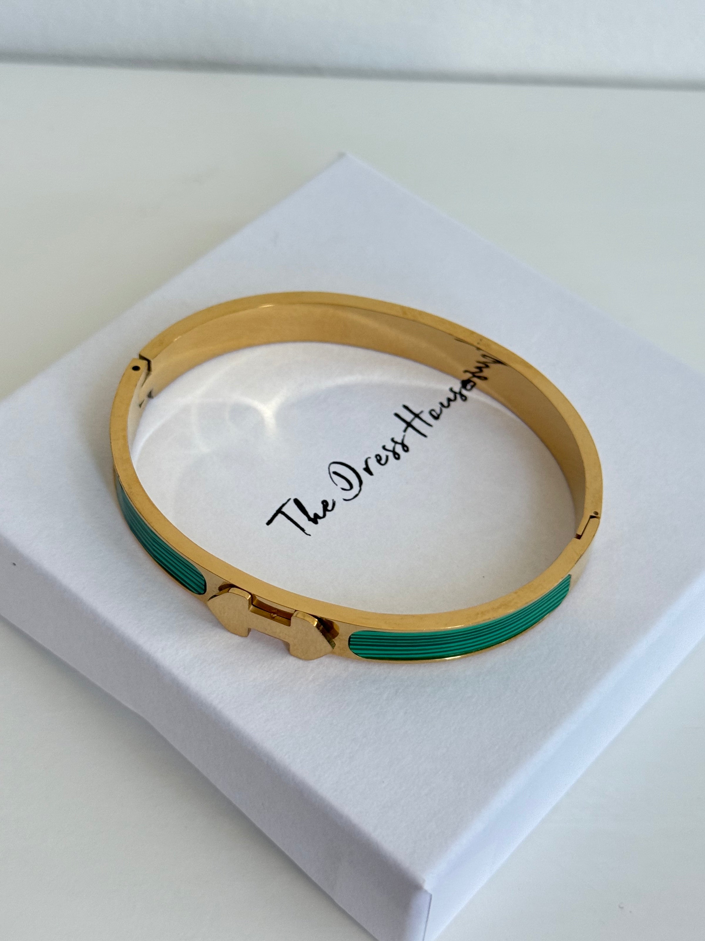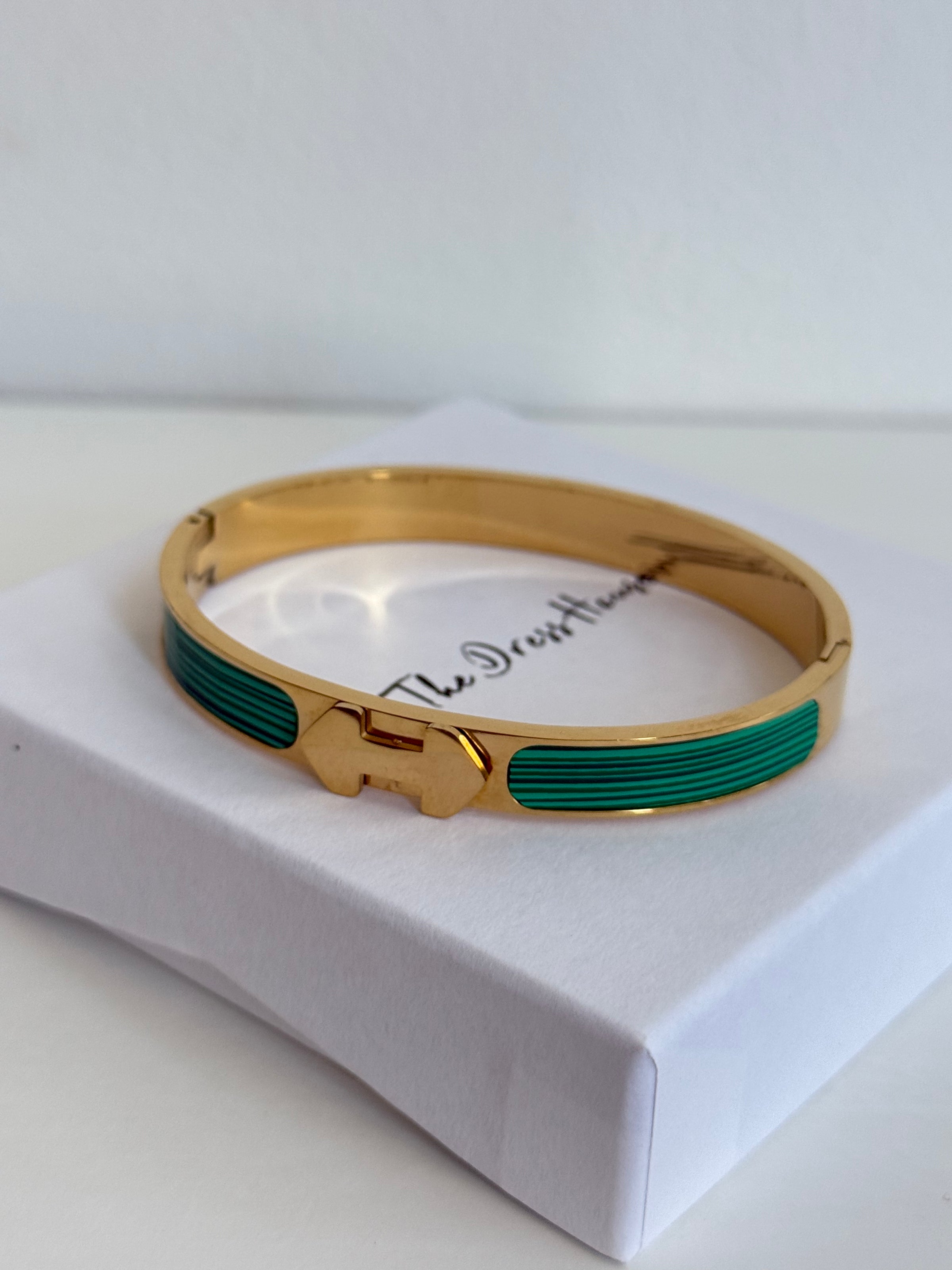 Bold yet elegant, this green and gold bangle brings a modern pop of colour to a timeless design. The polished gold finish contrasts beautifully with the rich green detail, creating a versatile piece that can be worn alone as a statement or stacked with other bangles for a layered look. Perfect for adding personality to both everyday outfits and evening style.