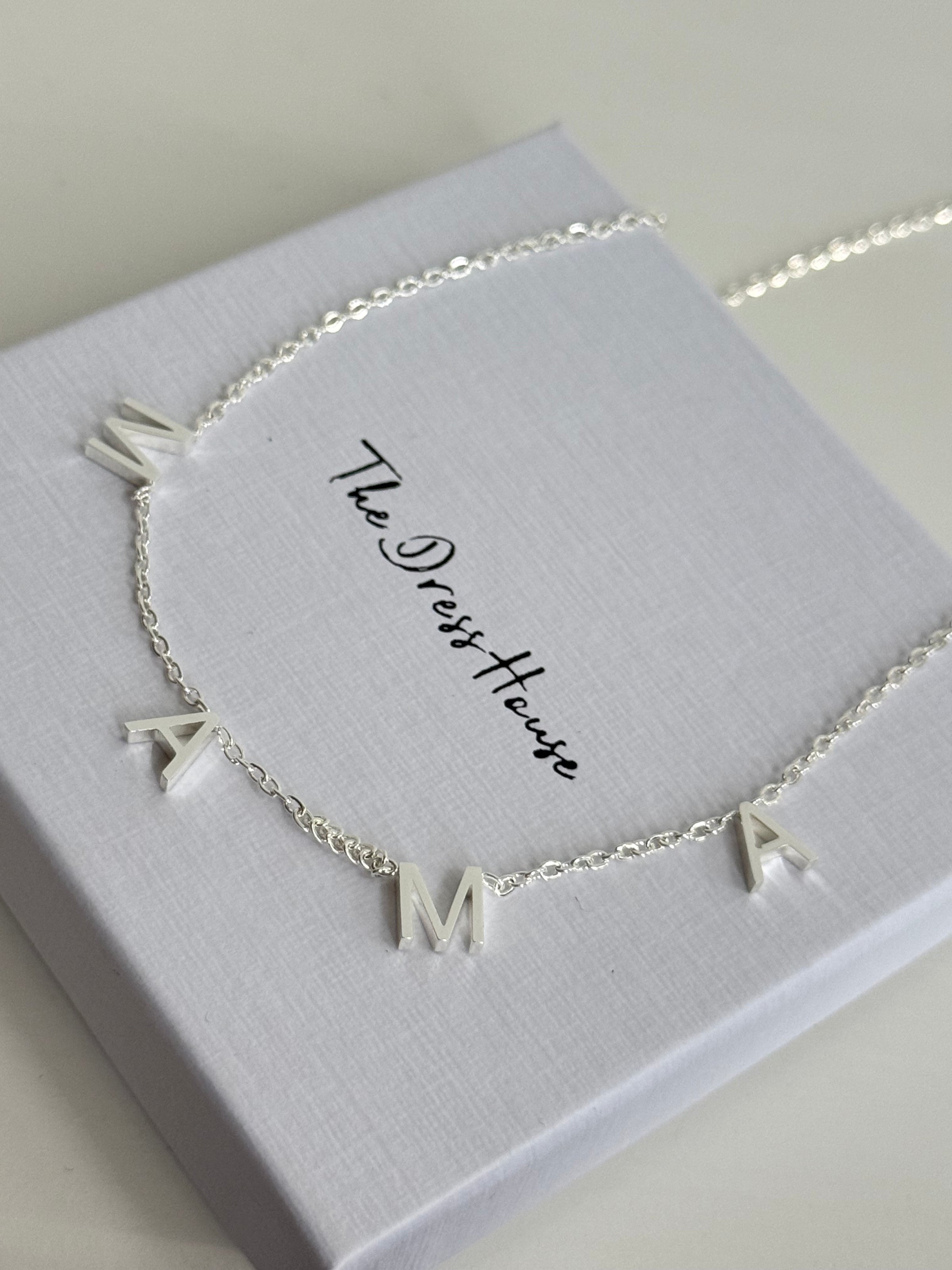 Celebrate the bond that means everything with this elegant silver “Mama” necklace. Crafted with a polished silver finish, the delicate script pendant sits beautifully on the neckline, offering a subtle yet meaningful touch of shine.