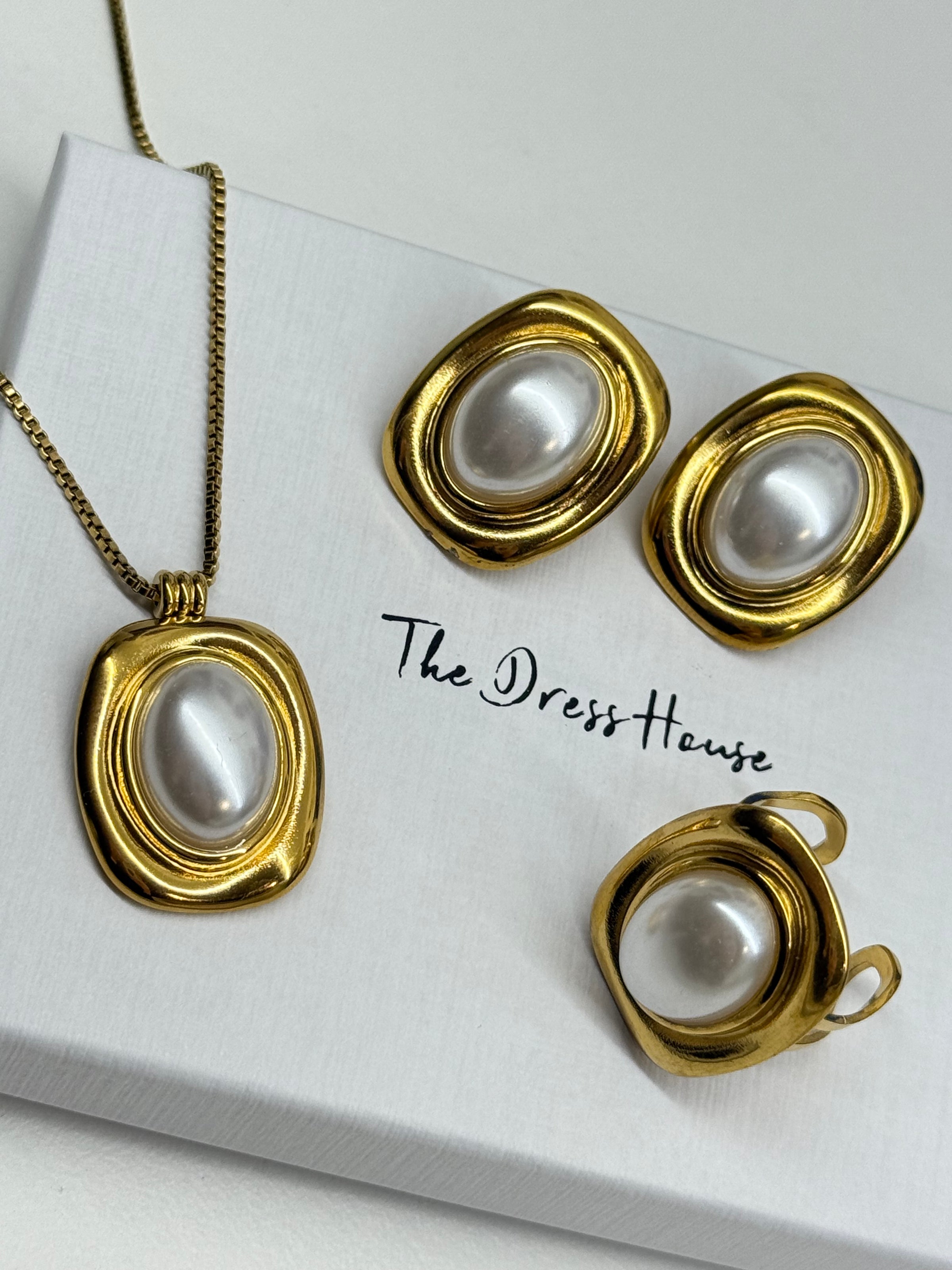 Ellie May - Gold Pearl Necklace Earring Ring Set