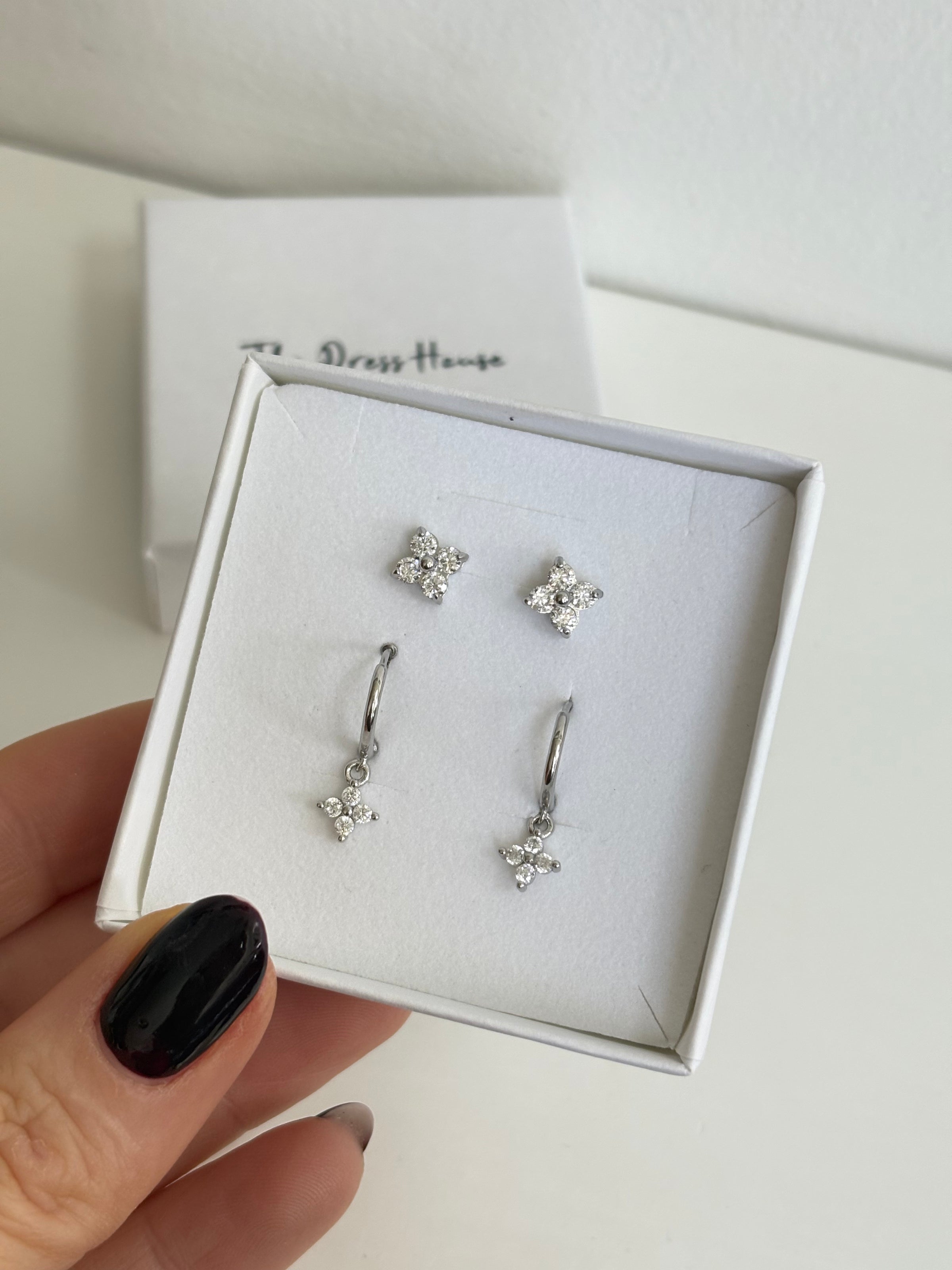 Elevate your everyday style with this elegant silver stacking earring set, featuring two timeless clover-inspired designs. The set includes a dainty gold hoop with a delicate clover charm and a matching silver clover stud—perfect for mixing, matching, and creating a chic layered look. Crafted from high-quality, waterproof materials, these earrings are made for effortless, all-day wear. Beautifully presented in a luxury The Dress House gift box, this set makes a stunning present for someone special or a stylish treat for yourself.