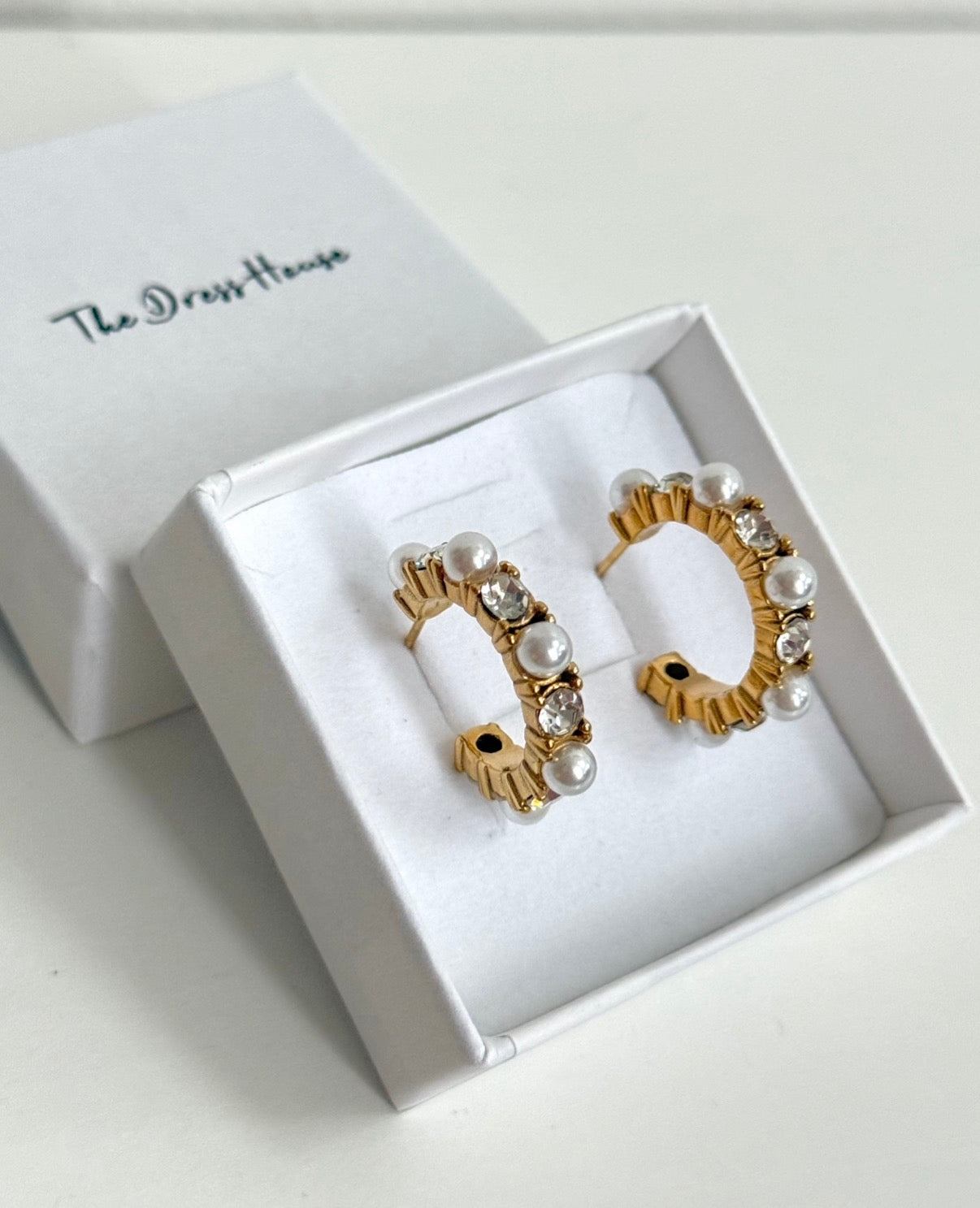 These elegant gold hoop earrings add a touch of glamour to your everyday jewellery. Featuring delicate pearls and shimmering diamantés scattered throughout the hoop, they strike the perfect balance between effortless style and subtle sparkle.