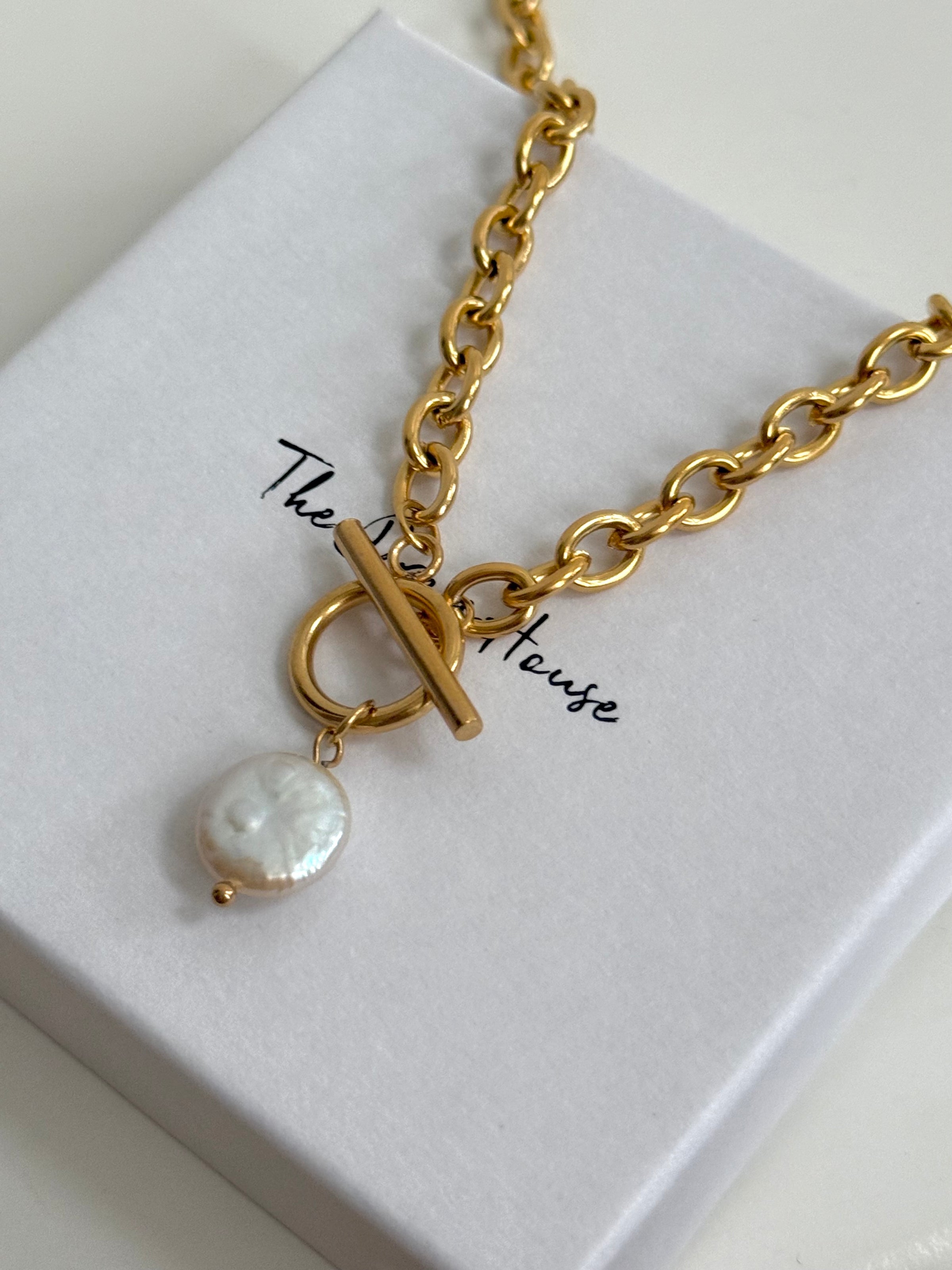 Effortlessly elegant with a modern edge, this gold link necklace features a classic T-bar fastening finished with a timeless pearl pendant. Designed to sit beautifully at the collarbone, it adds a polished touch to both everyday outfits and special occasion looks.
