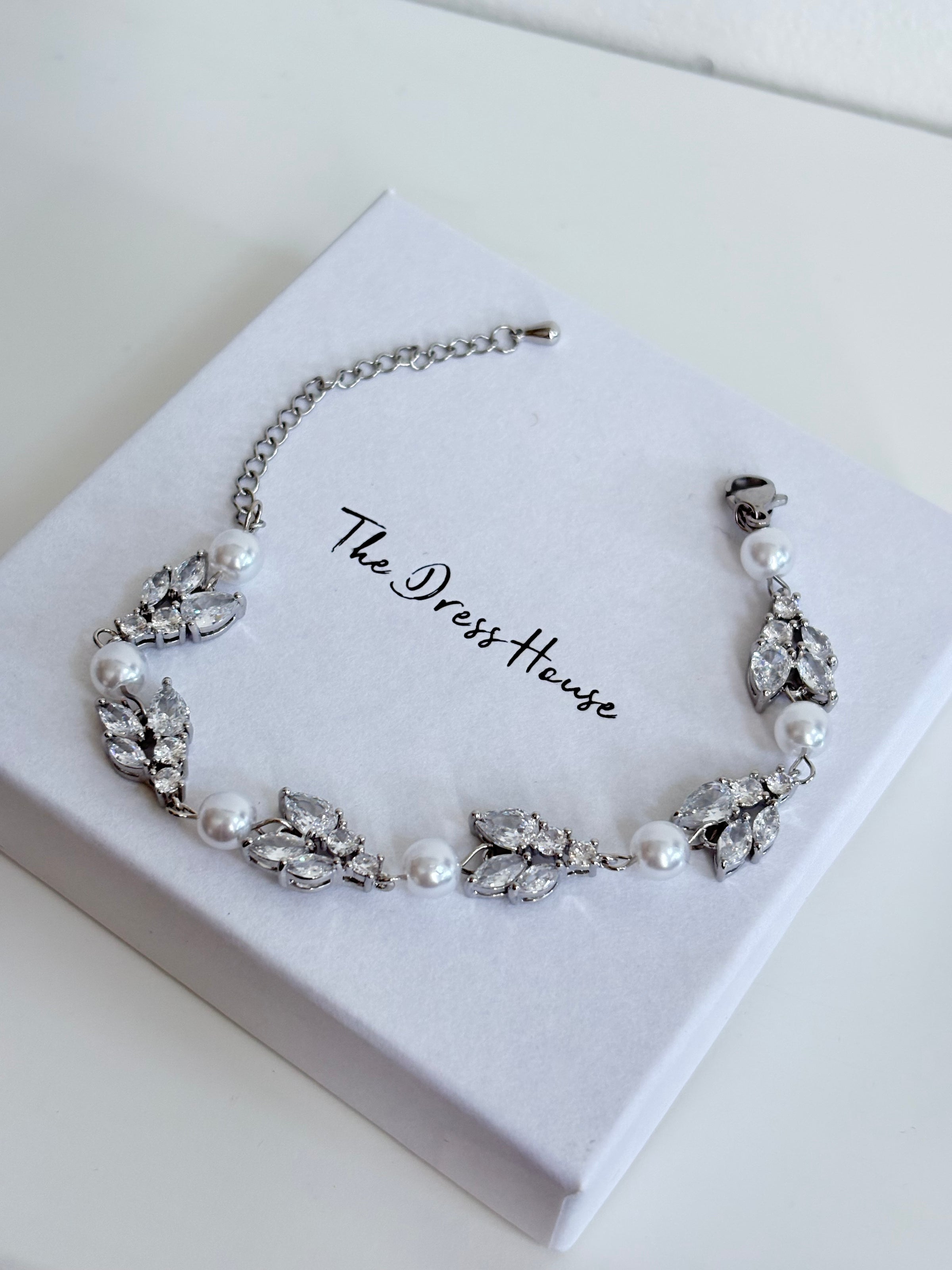 Wear this slender crystal leaf and pearl bracelet for a touch of vintage elegance. Made with teardrop ivory pearls interspersed with delicate semi precious quartz-embellished leaves, this is an understated choice to complete a vintage or classic bridal look. Complete extension chain for the perfect fit.