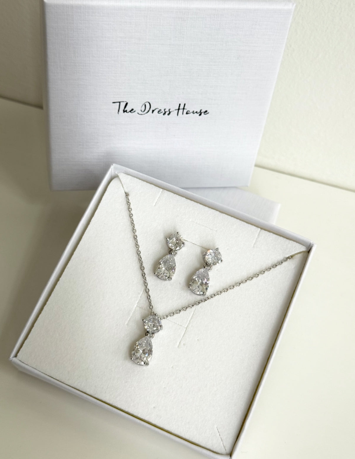 A beautiful dainty bridal jewellery set featuring an elegant design made up of glistening pear-drop, marquise and solitaire cubic zirconia crystal. A timeless wedding jewellery set, perfect for a classic or vintage bridal look.